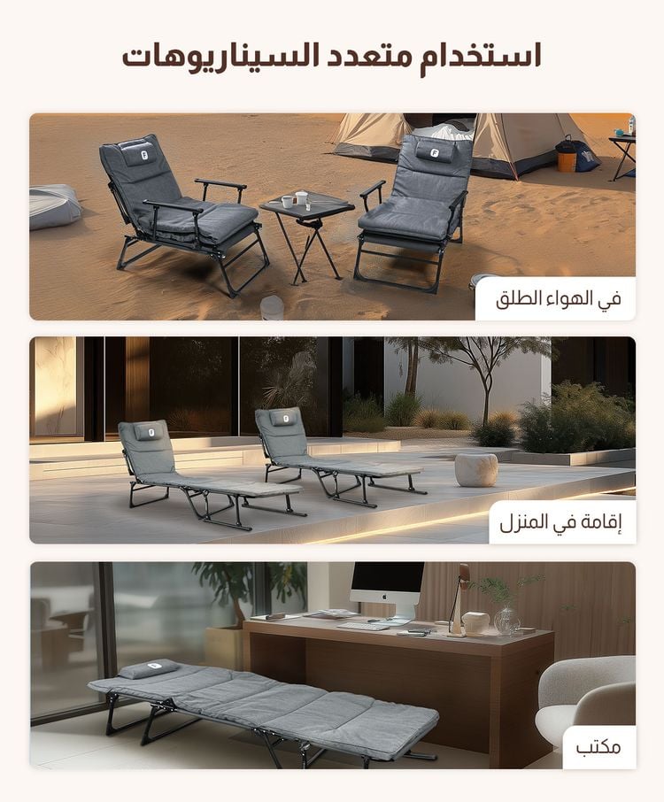 استمتع بتجربة جلوس واسترخاء فاخرة في أي مكان مع الكرسي-السرير القابل للطي المصمّم خصيصًا للرحلات، الشاطئ، المخيمات، وحتى الاسترخاء في المنزل أو الحديقة.